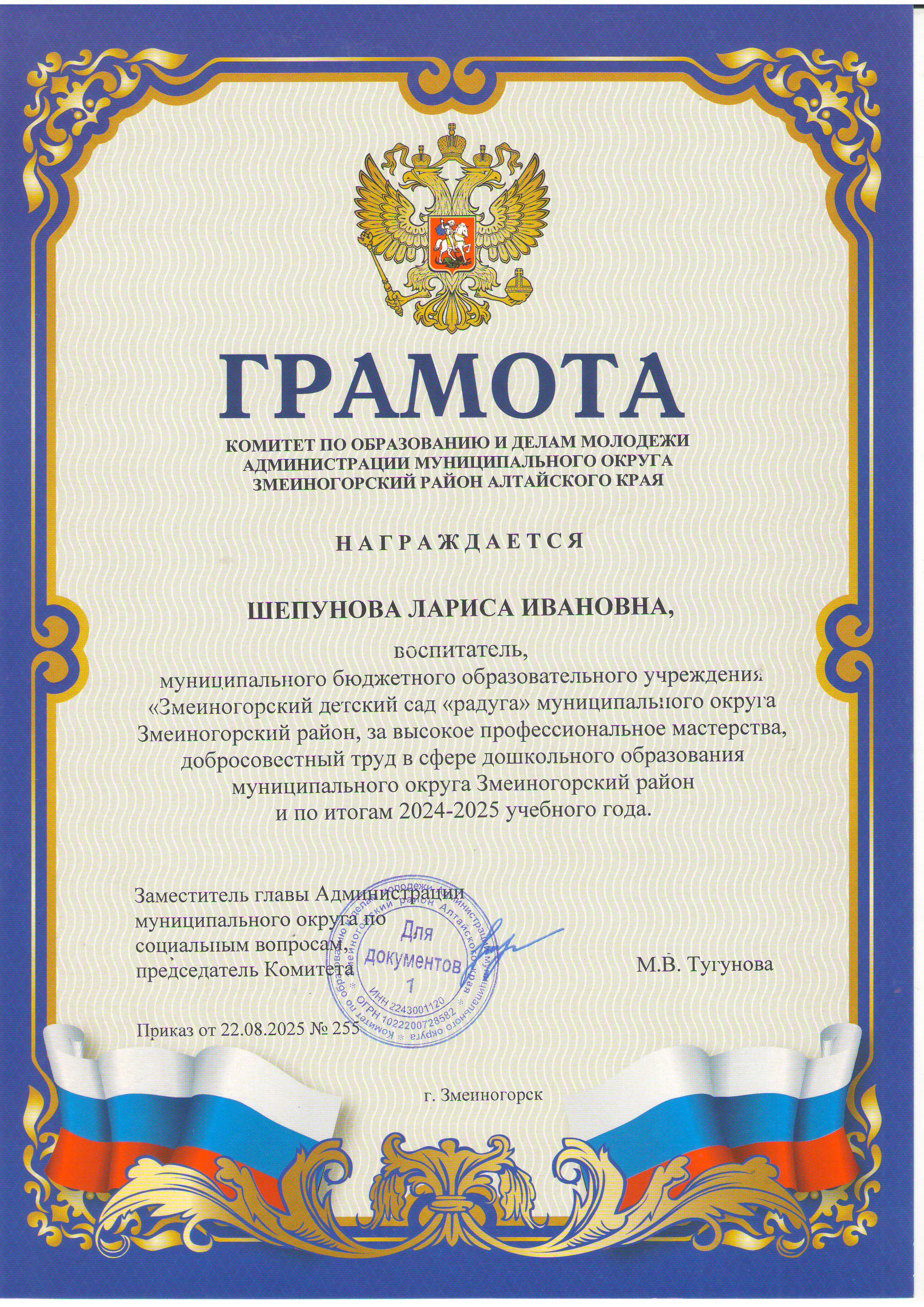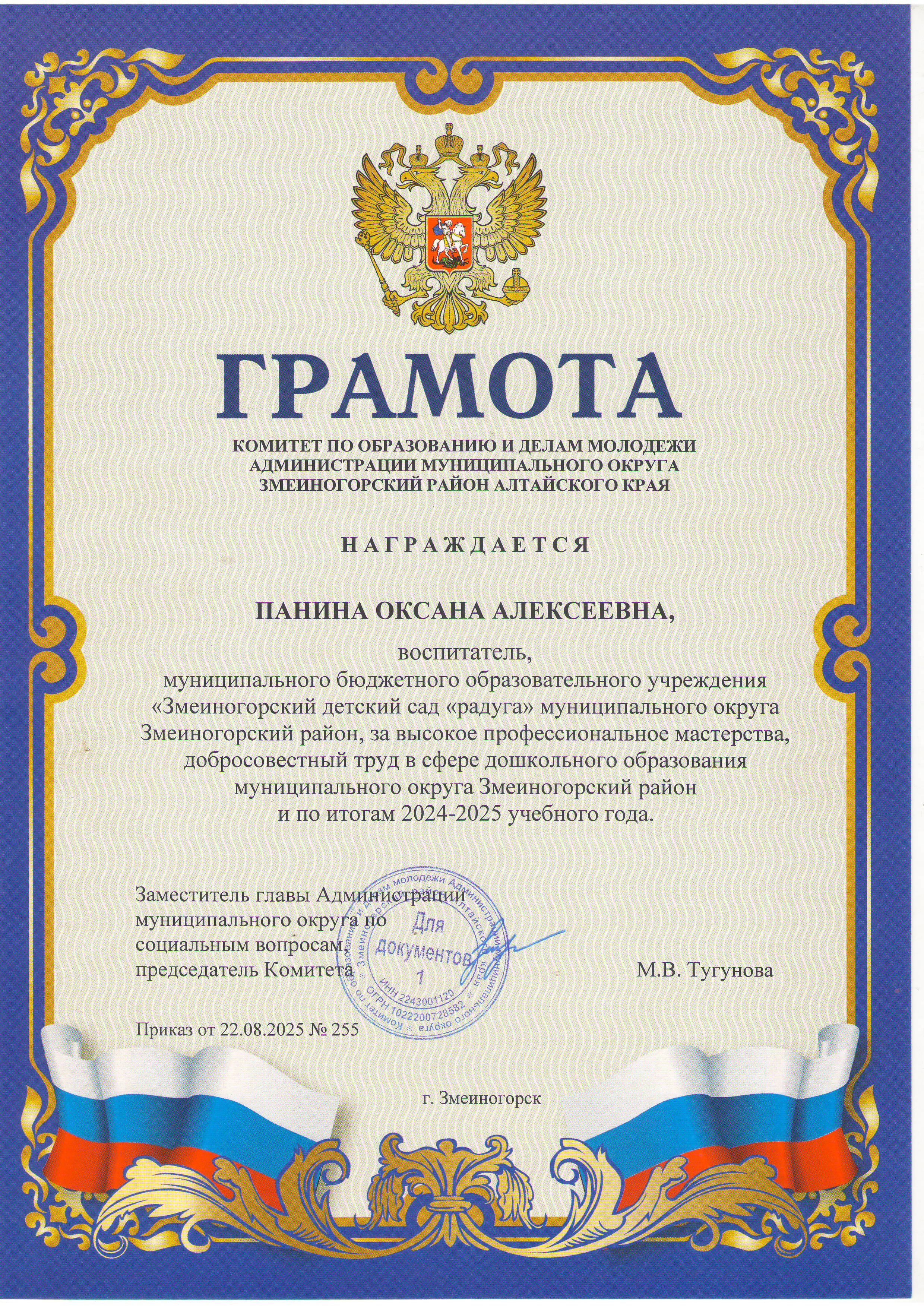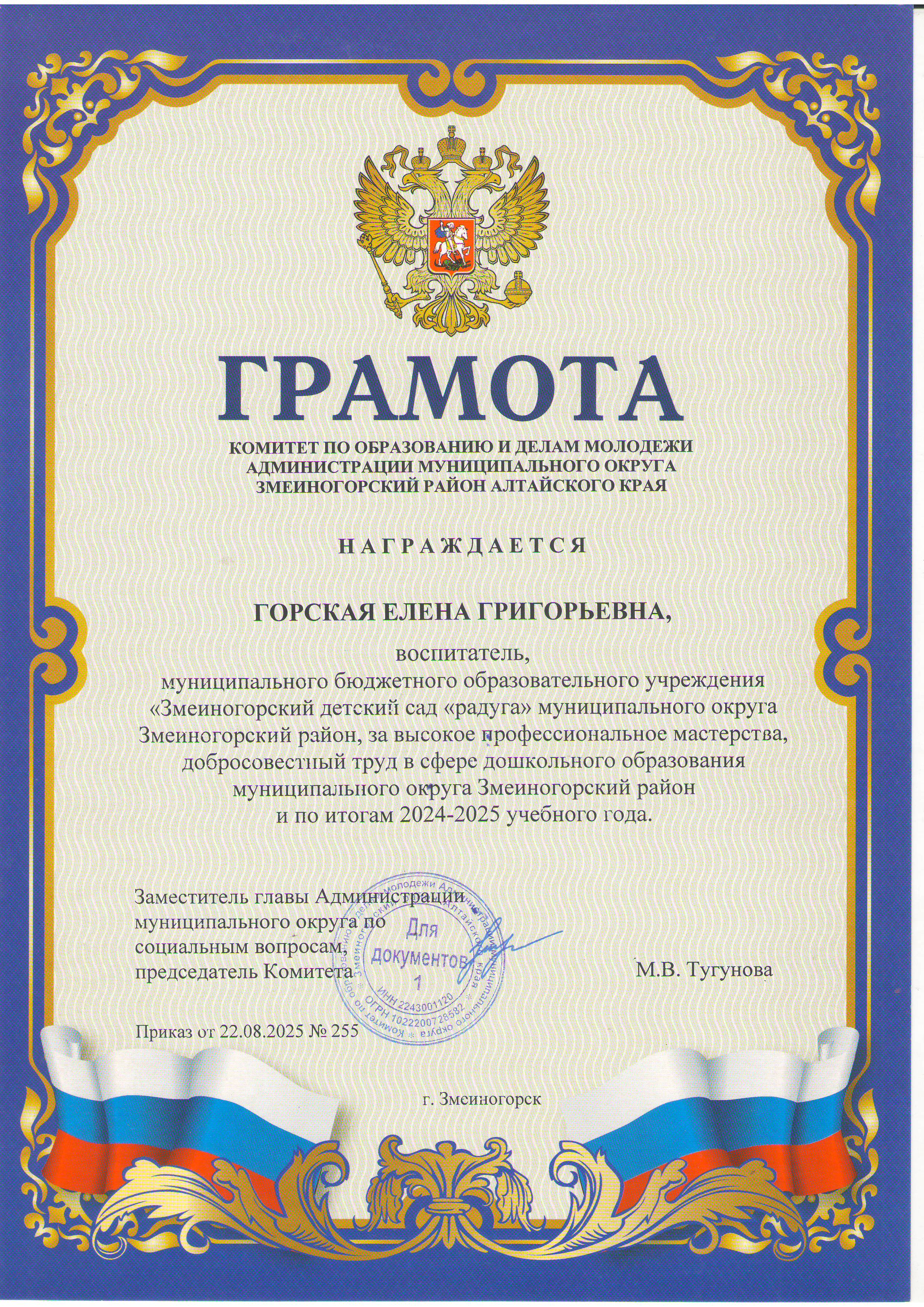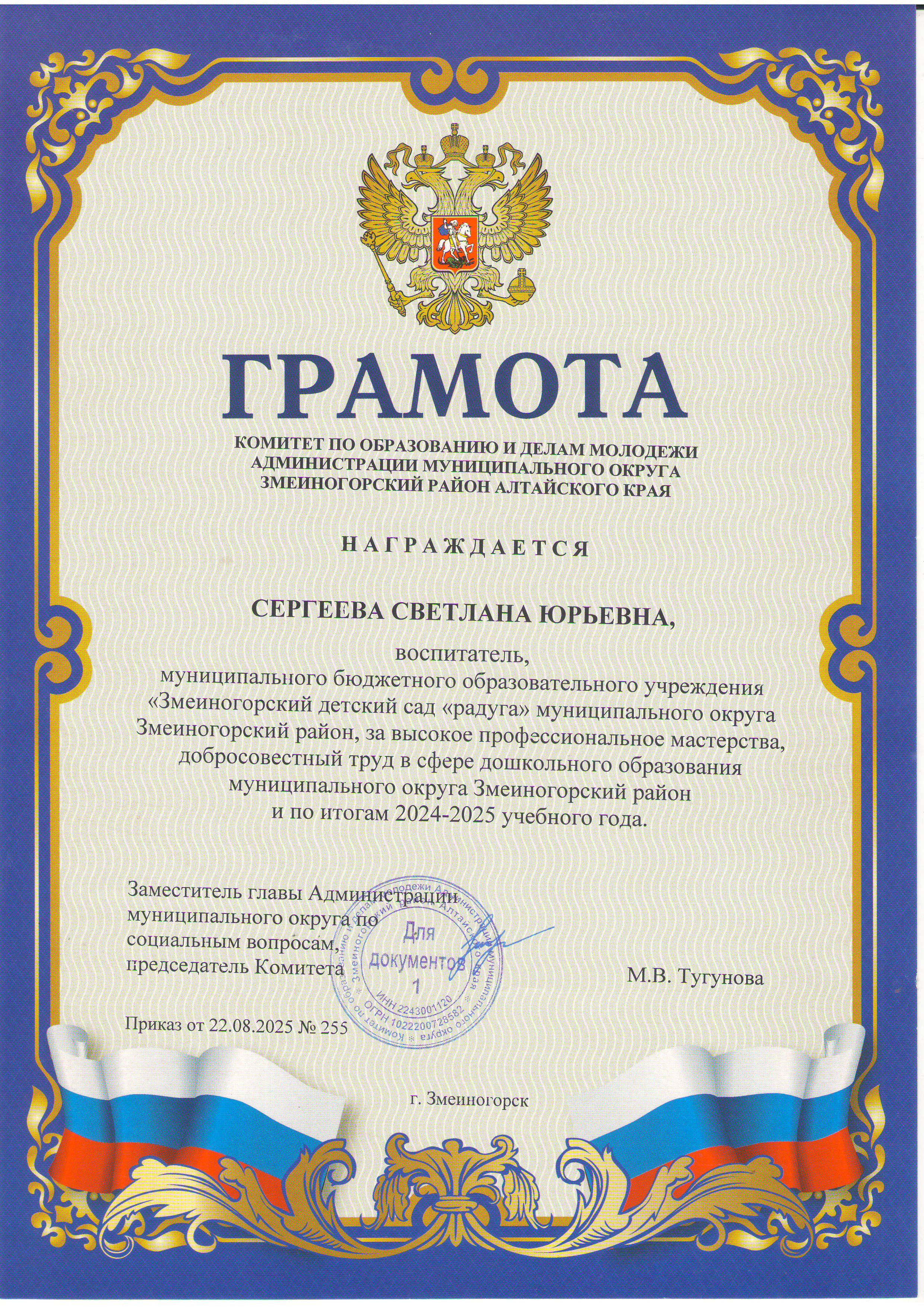 22.08.2025 г. были награждены грамотами Комитета по образованию и делам молодежи Администрации муниципального округа Змеиногорский район Алтайского края педагоги МБДОУ "Змеиногорский детский сад "Радуга" Сергееева С.Ю., Панина О.А., Шепунова Л.И., Горская Е.Г. за высокое профессиональное мастерство, добросовестный труд в сфере дошкольного образования и по итогам 2024-2025 учебный год.