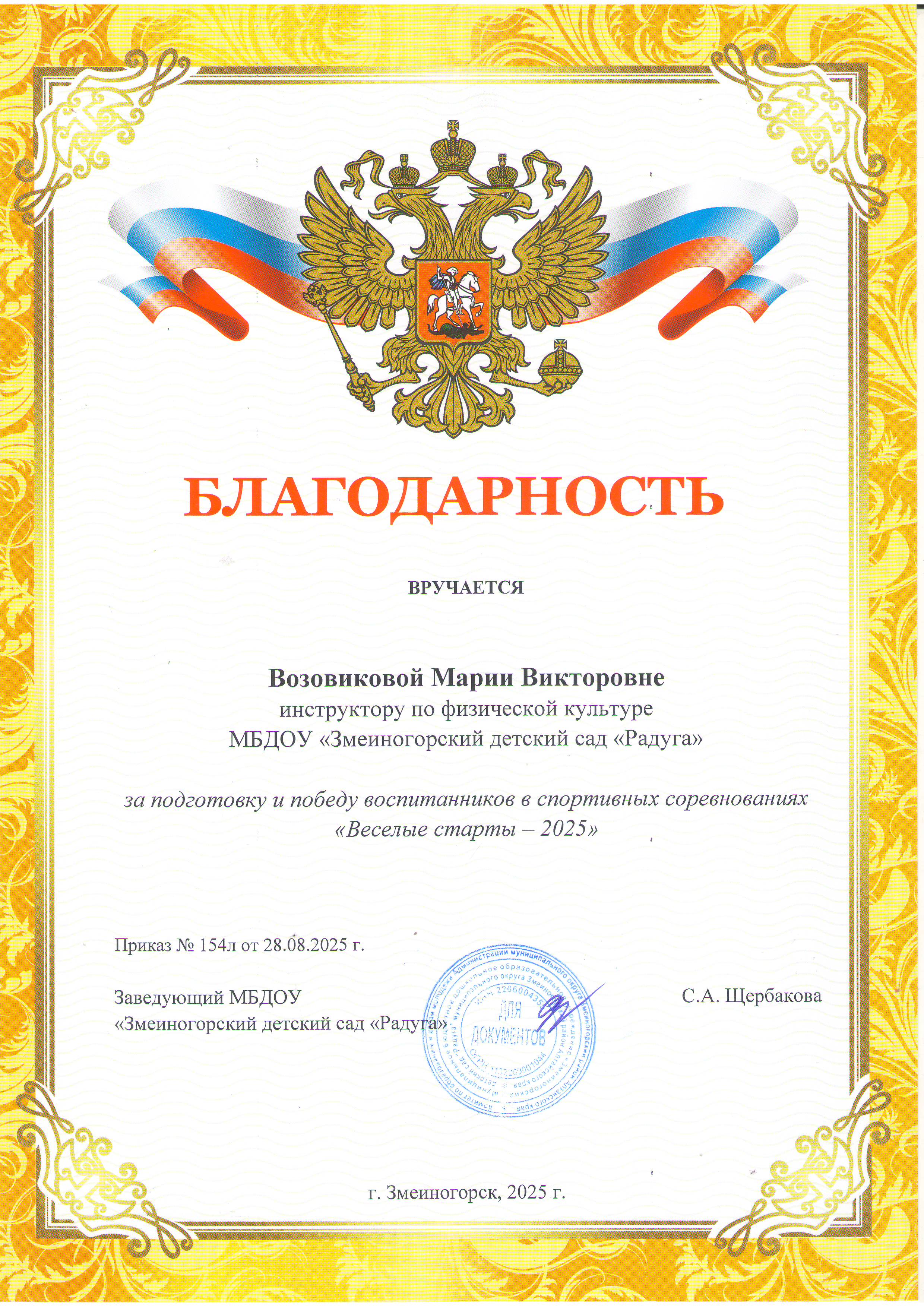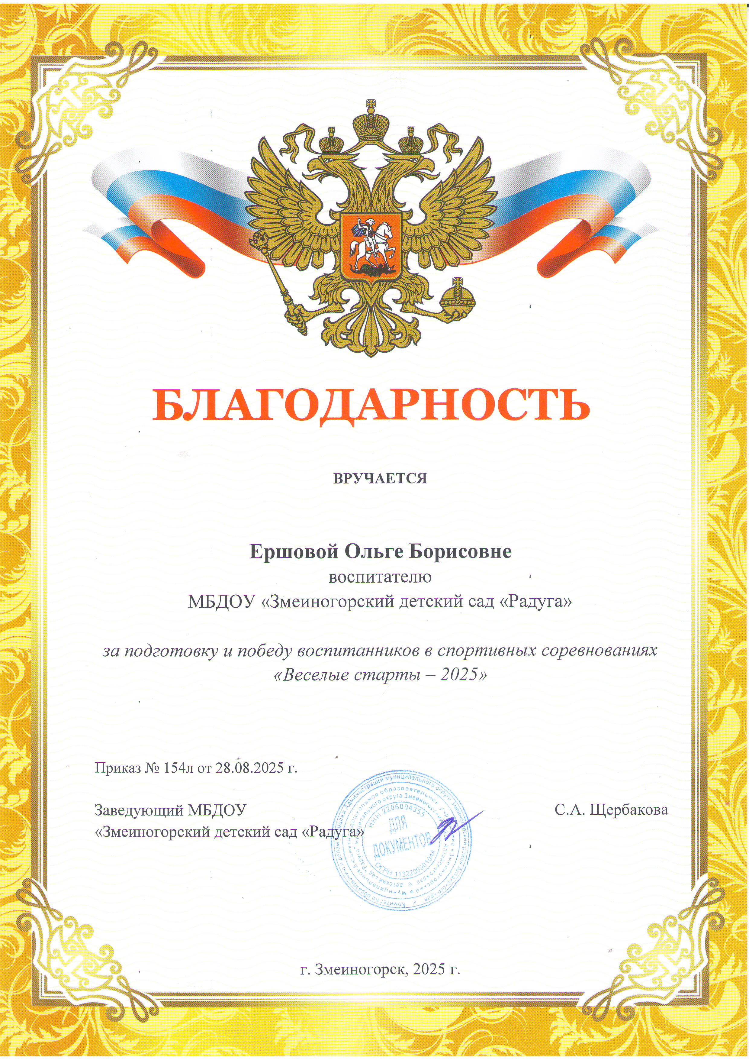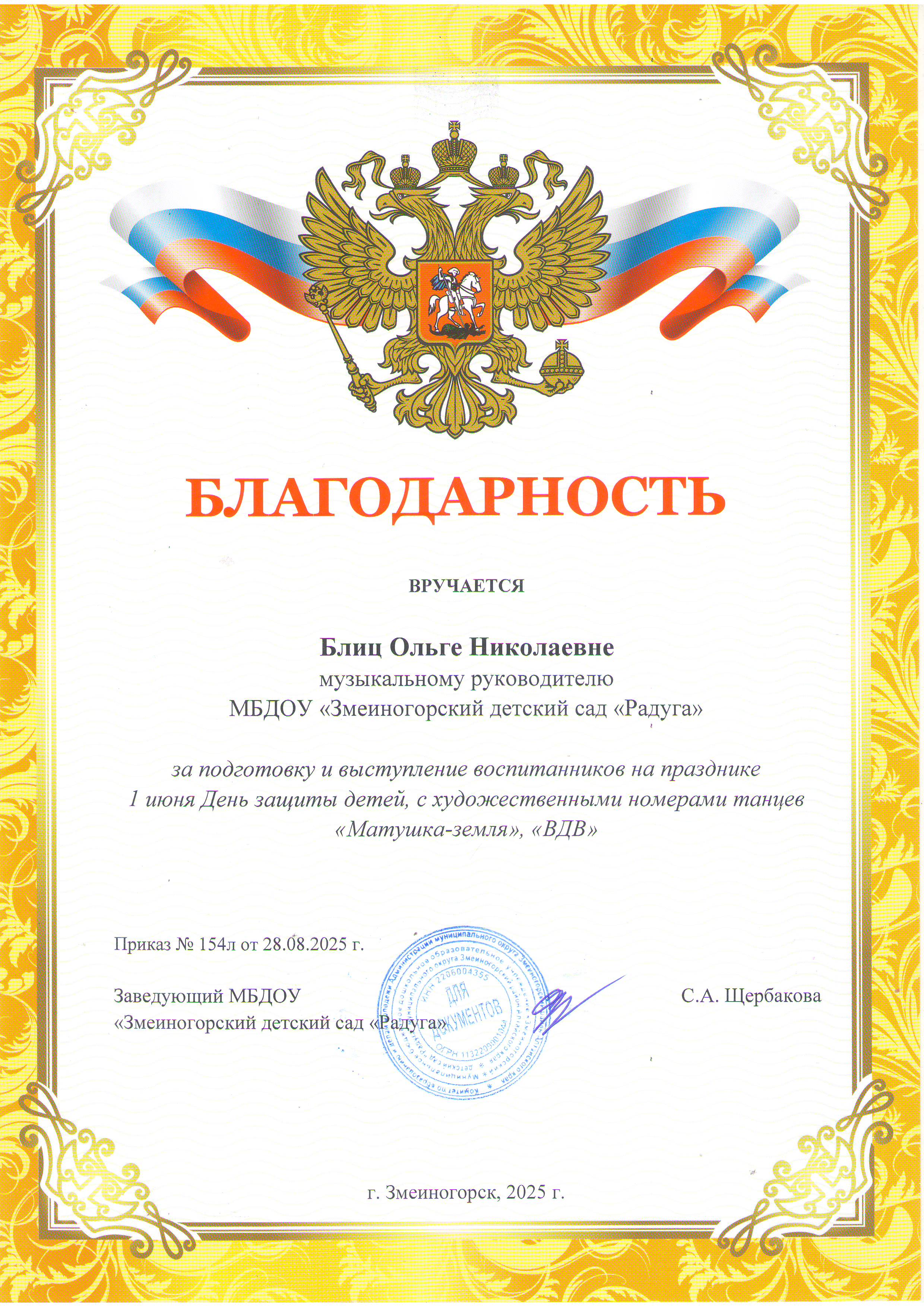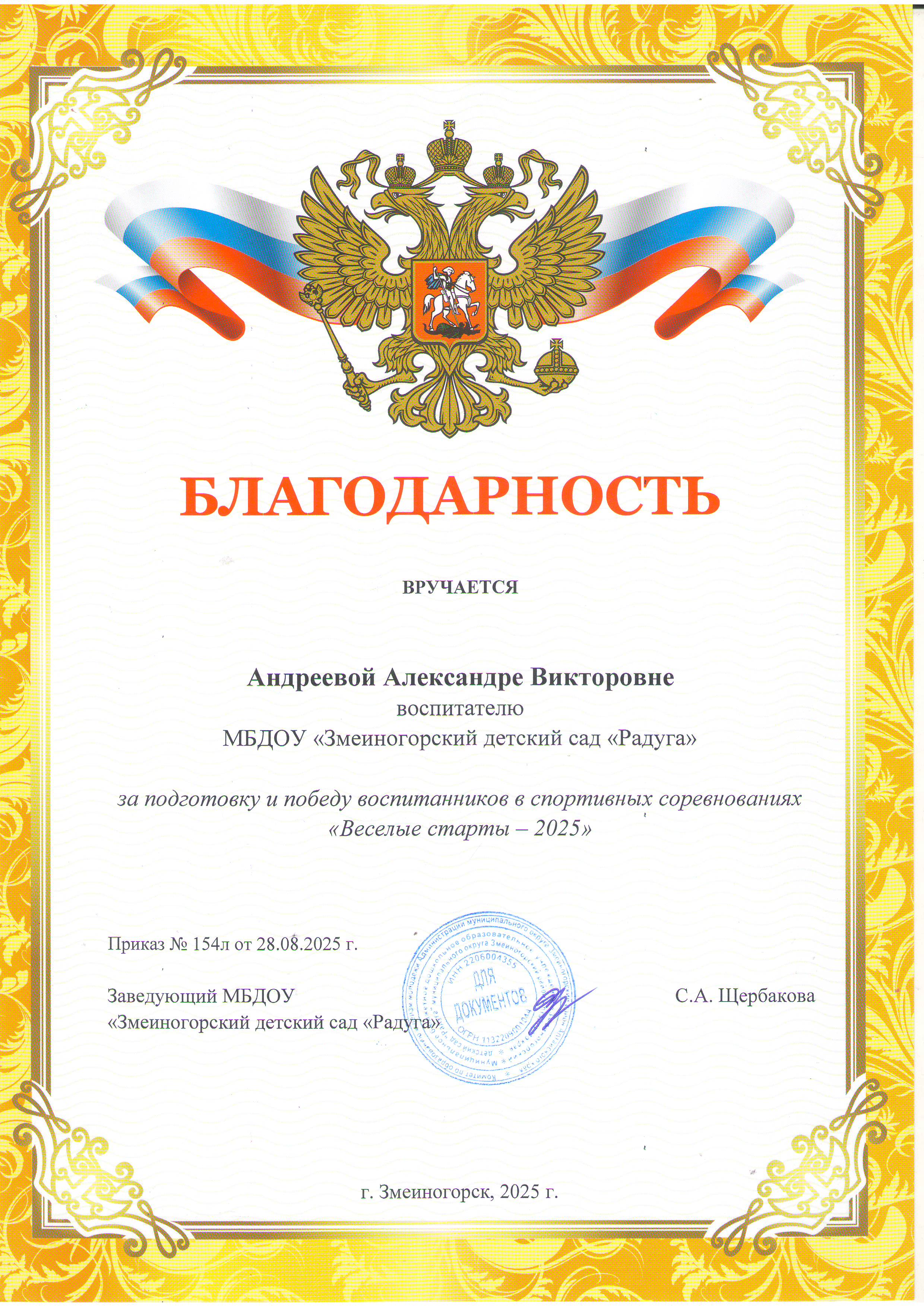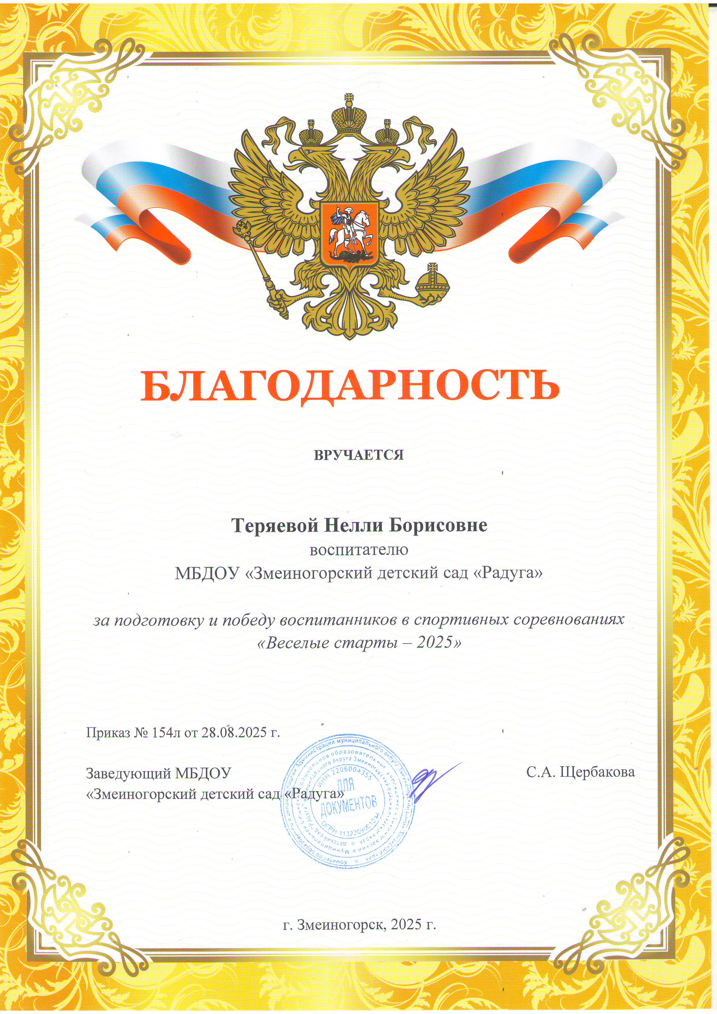 22.08.2025 г. были награждены грамотами Комитета по образованию и делам молодежи Администрации муниципального округа Змеиногорский район Алтайского края педагоги МБДОУ "Змеиногорский детский сад "Радуга" Сергееева С.Ю., Панина О.А., Шепунова Л.И., Горская Е.Г. за высокое профессиональное мастерство, добросовестный труд в сфере дошкольного образования и по итогам 2024-2025 учебный год.