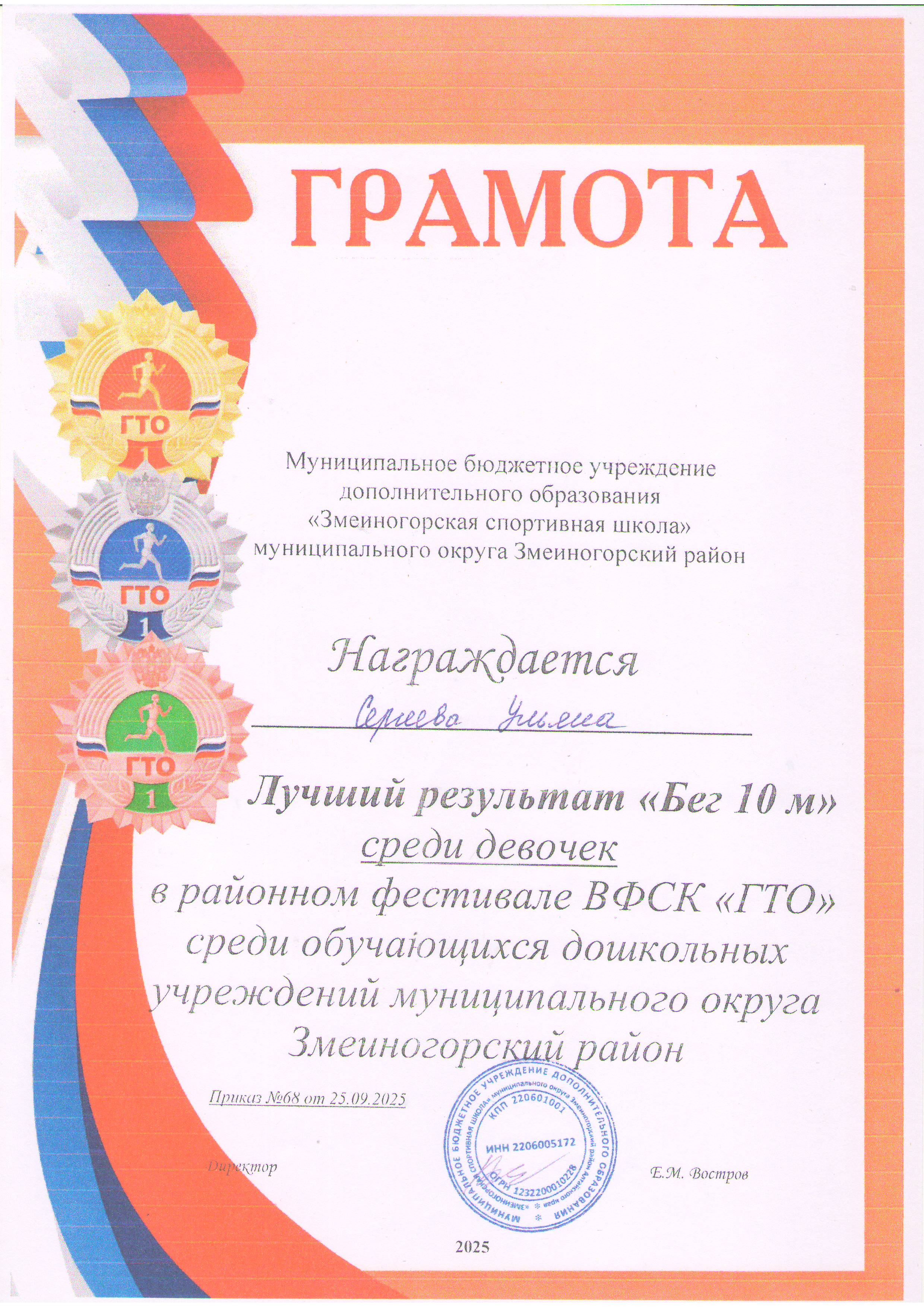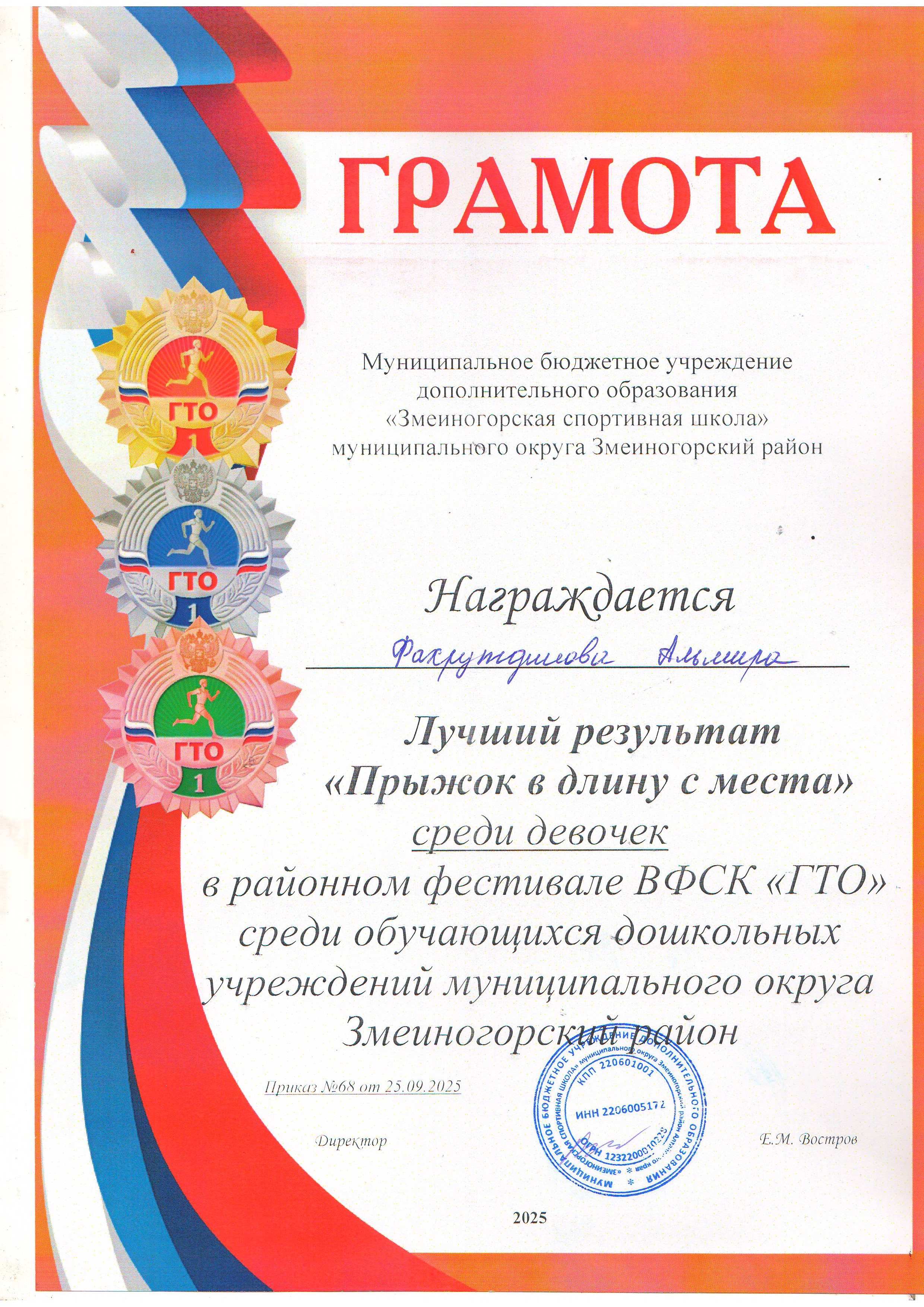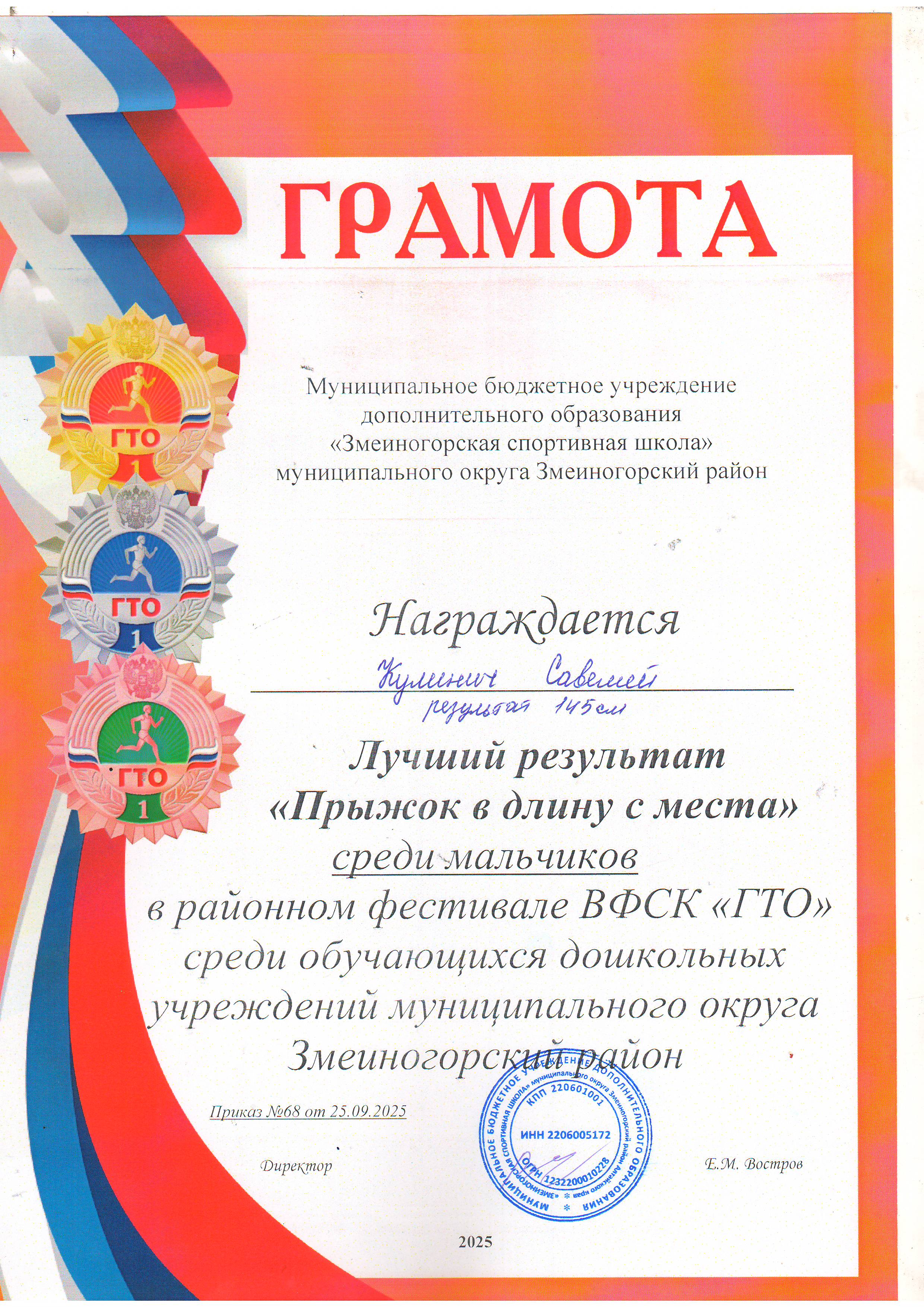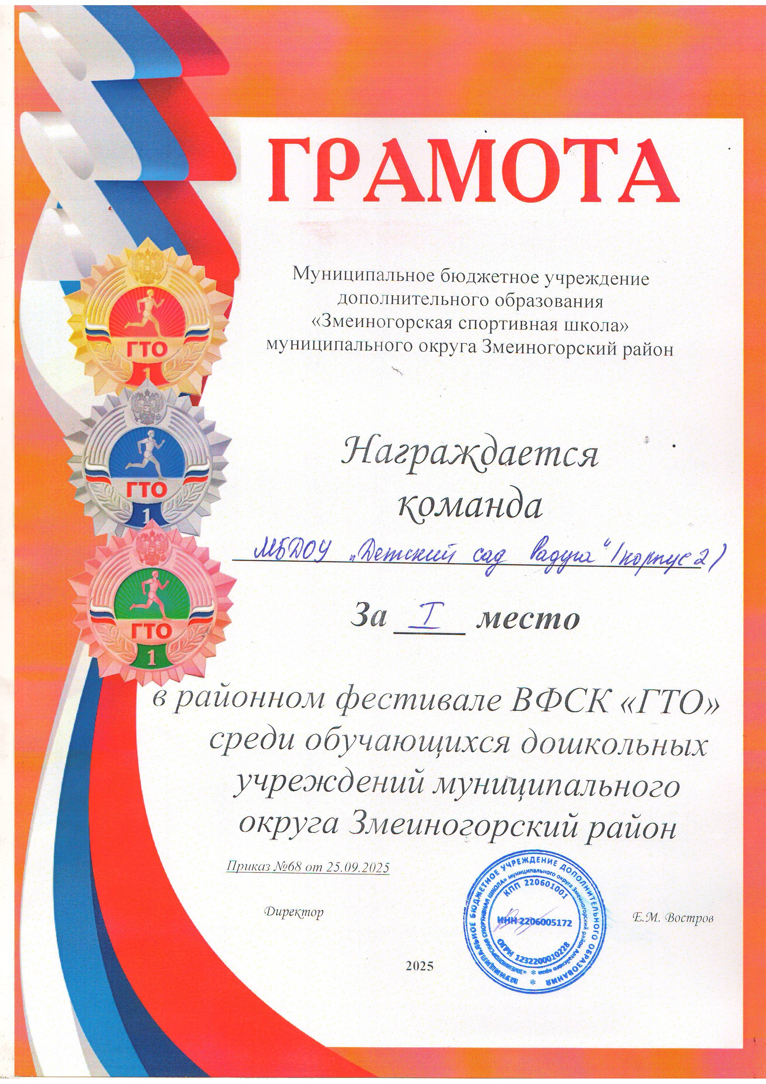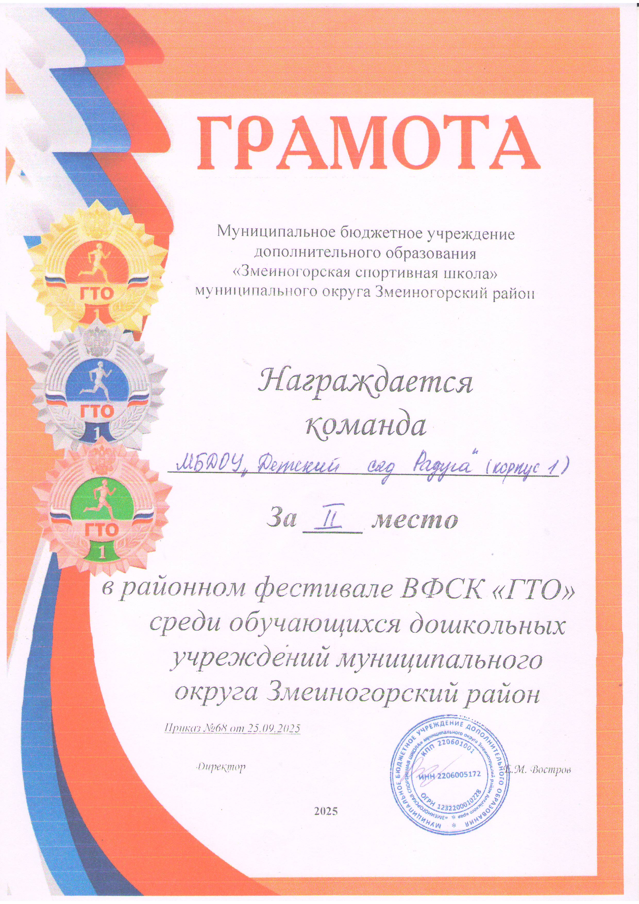 25.09.2025 г. на базе МБУДО «Змеиногорская спортивная школа», спорткомплекс Рудный прошел Всероссийский физкультурно-спортивный комплекс «Готов к труду и обороне». По итогам спортивного соревнования воспитанники подготовительной к школе группы МБДОУ «Змеиногорский детский сад «Радуга» корпус 2 заняли I место, корпус 1 заняли II место. Поздравляем, молодцы!!!